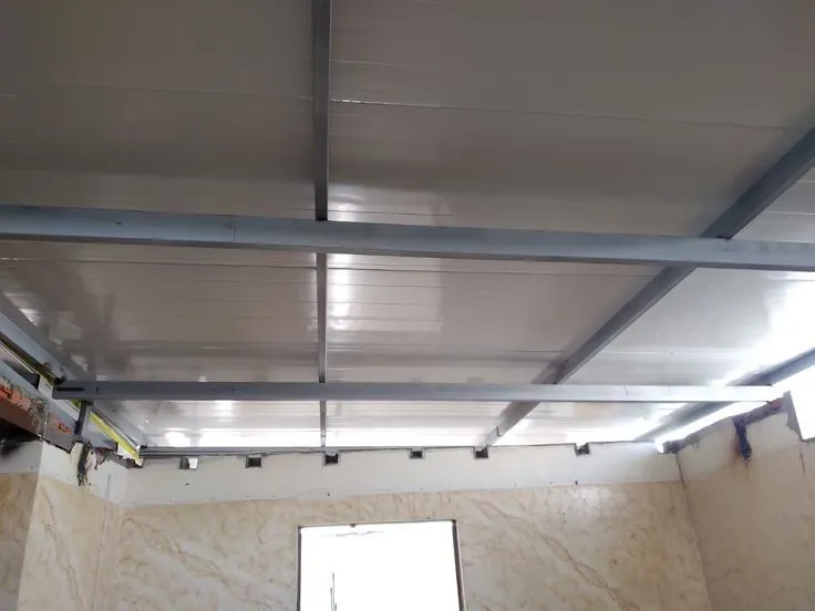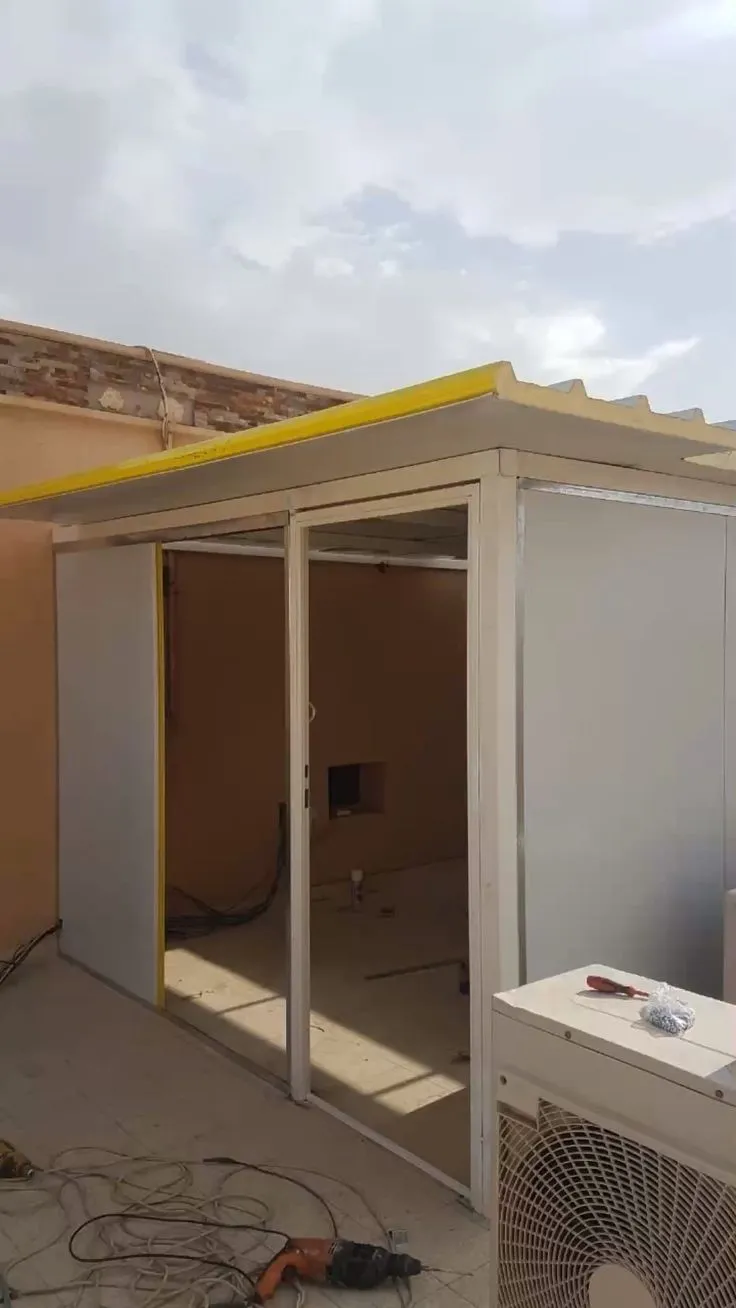 - تركيب السقف بنفس مواصفات الحوائط، مع تثبيته باستخدام زوايا الألمنيوم والمسامير لضمان العزل والشكل المتناسق.