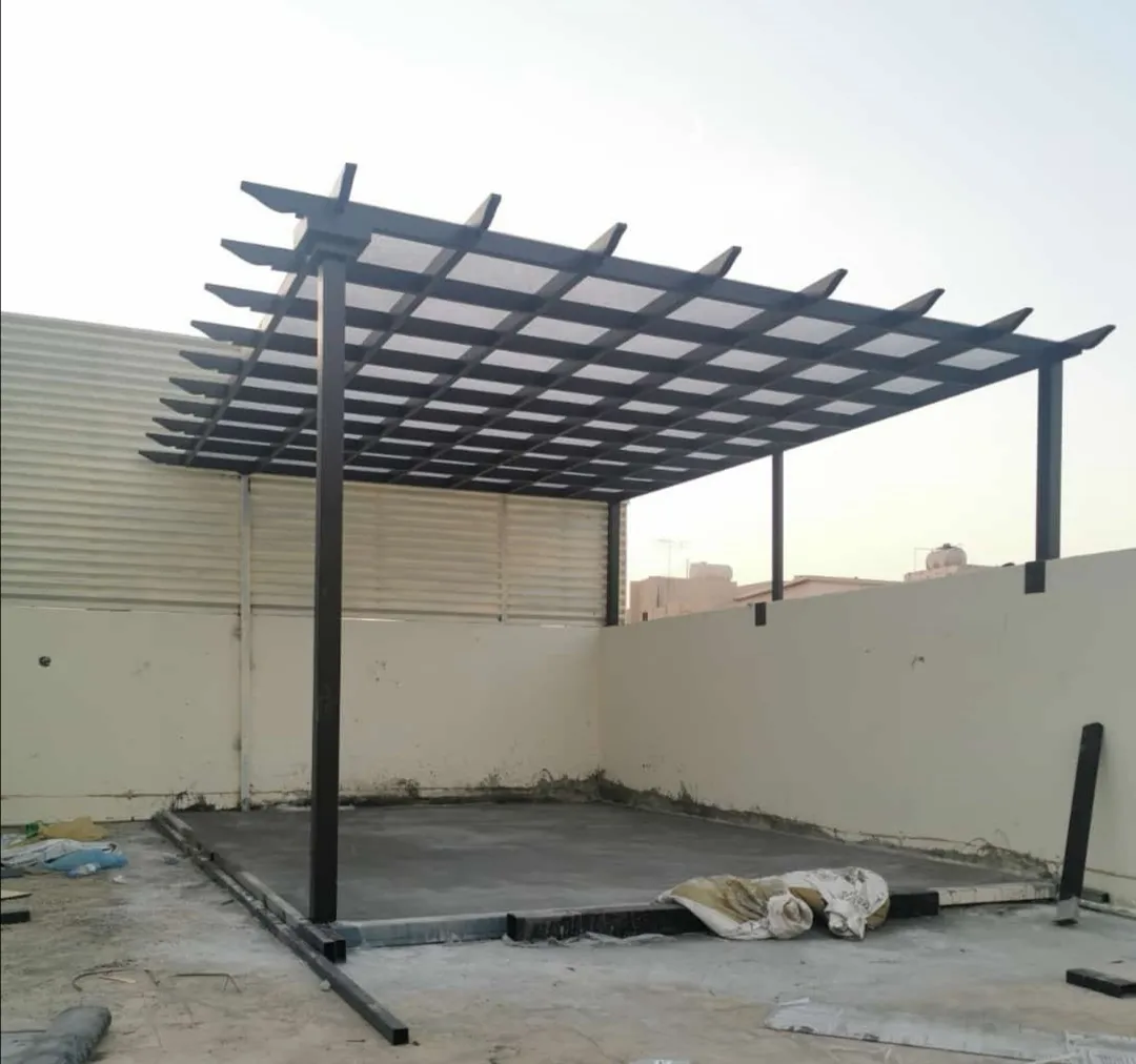 مظلات مائلة بزاوية: تصميم يساعد على تصريف مياه الأمطار بسرعة، ويمنع تجمع المياه فوق السطح، مما يطيل عمر المظلة.