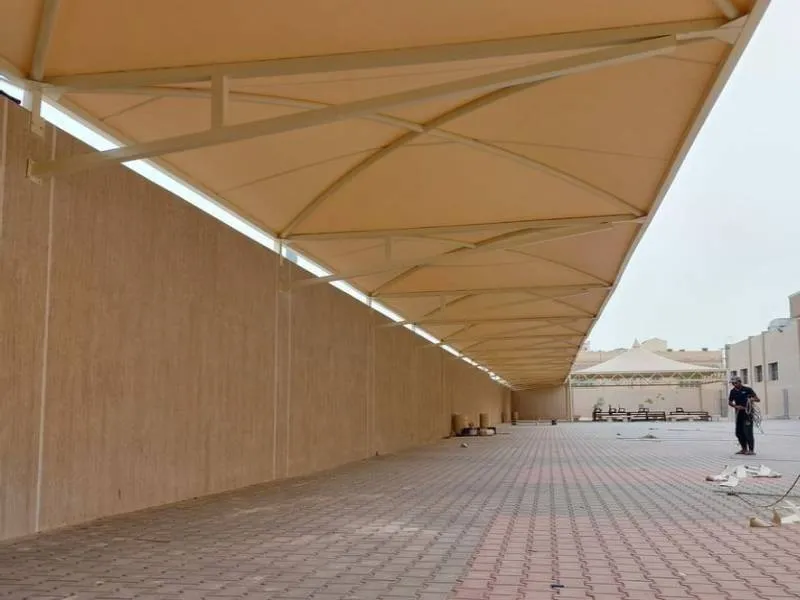 حفر القواعد يتم حفر قواعد عميقة للأعمدة الداعمة على مسافات محددة (بناءً على أبعاد المظلة)، عادةً بعمق 5060 سم لضمان الثبات.